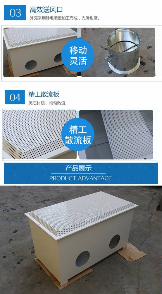 高效送風(fēng)口為千級、萬級、十萬級凈化空調(diào)系統(tǒng)較為理想的終端過濾裝置,可廣泛于醫(yī)藥、衛(wèi)生、電子、化工等行業(yè)的凈化空調(diào)系統(tǒng)。高效送風(fēng)口是用作改造和新建1000-300000級各級潔凈室的終端過濾裝置,是滿足凈化要求的關(guān)鍵設(shè)備。高效送風(fēng)口包含靜壓箱,散流板,高效過濾器,與風(fēng)管的接口可為頂接或側(cè)接。